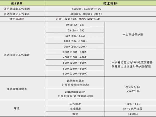 过流、欠流、堵转、断相、三相电流不平衡、过压、欠压、短路、漏电(选配)等故障保护