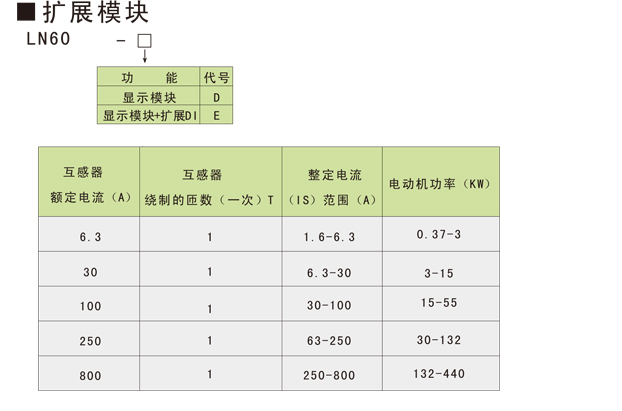 LN60电动机保护器由两部分组成:保护器模块本体、扩展模块(可以是显示模块或者是显示模块附加8路DI功能)。保护器本体可以独立运行,实现测量功能、保护功能、电动机启/停控制功能和远程通讯功能;扩展模块作为辅助装置,可以根据需要进行配置。